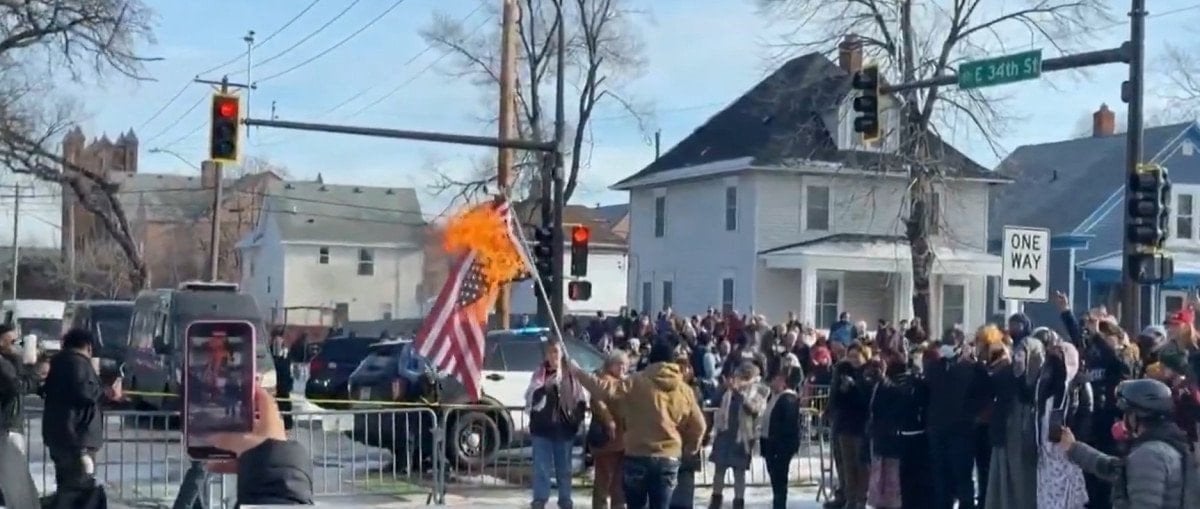 Olay yerinde toplanan vatandaşlar, ülkelerinin yönetimine karşı tepkilerini dile getirmek amacıyla sembolik olarak ABD bayrağını yaktı.