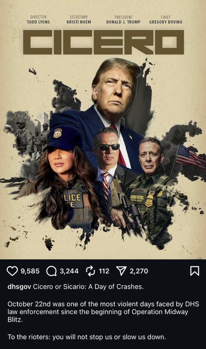 DHS tarafından yayınlanan görsel, bir kampanya davetinden çok; siyasi bir deklarasyon havası taşımaktadır. Altında yer alan ifadede; “To the rioters: you will not stop us.” (İsyancılara: Bizi durduramayacaksınız) yazmaktadır. Bu ifade, klasik retorikte Cicero’nun devleti savunma çağrısına benzer bir ton taşımaktadır. Ancak üzerine ulusa yönelik bir Sicario tonu eklenmiştir: Yasa adına, yasa dışına çıkarak bir öfke sergileme. Bu durum, meşruiyetin yeniden tanımlanması gibi bir anlayışa işaret eder.